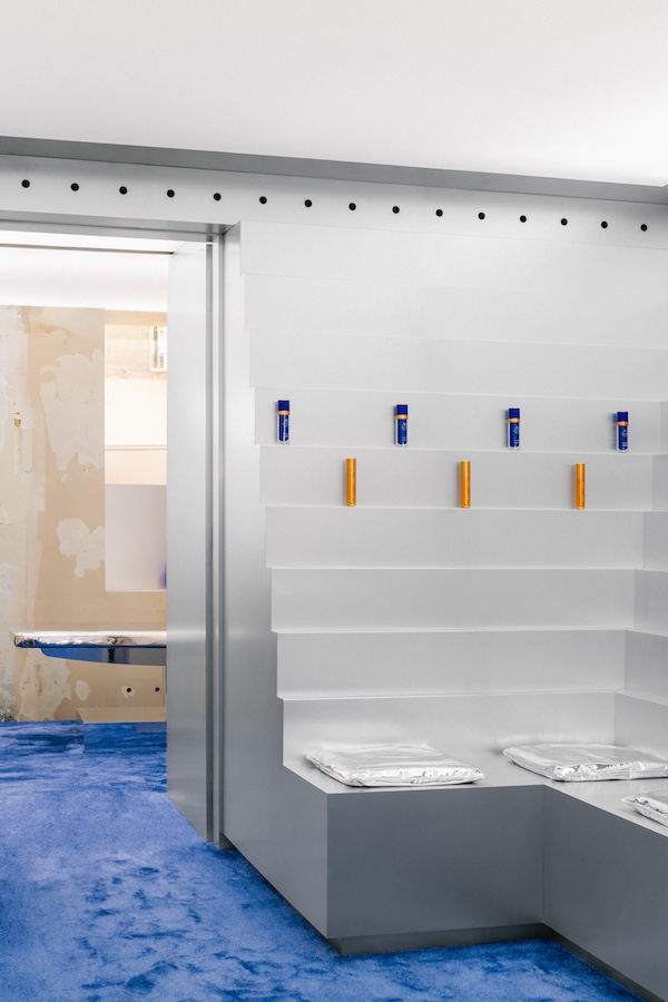 Further into a treatment room, a dystopian scene from a sci-fi movie comes to life with blue flooring, and an argent treatment chair, evoking an episode from the future. This scene offers captivating glimpses into the 17th-century Palais courtyard, where historic charm is punctuated with contemporary art, creating a palpable sense of contrast while drenching the space in natural light. “The geometry is also in dialogue with the perfect rectangular shape of Palais Royale,” Nuriev notes, underscoring the interplay between history and modernity, that intricately shapes the essence of his work. The room’s cool, ambient lighting heightens the sense of etherealism, while the windows’ natural light, creates a paradox of coolness and warmth.