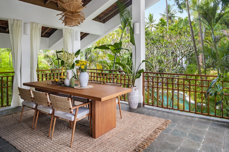 From yoga shalas that open into the jungle-style garden to balcony dining surrounded by greenery.