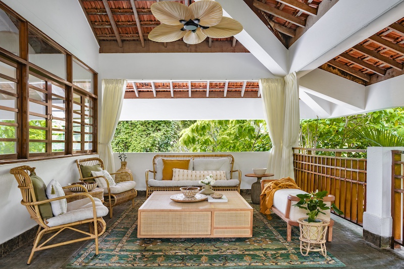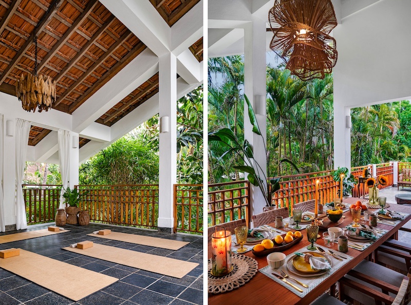 Goa‘s coconut groves and lush blooms create a perfect backdrop for this exclusive Airbnb Wellness Retreat. This jungle-inspired Goan retreat is enwrapped in tall bamboo trees, fragrant blossoms and dense foliage. The interiors radiate a play of organic textures and soothing earthy tones. Sunlight streams in through the large glass windows, warming the space with its golden glow. The indoors are adorned with organic and rustic design elements, creating a cosy and inviting atmosphere. This eco-chic Indo-Portugese villa features two bedrooms, a sprawling living with outdoor dining, a kitchen and an outdoor patio. A special spa room and pool for wellness therapies, elongated balconies that double as yoga ‘shalas’ and another outdoor pool quite complete the experience of a wellness and yoga retreat. The décor strikes a balance between modern, traditional style and sustainable design. One can experience the allure of sprawling bedrooms adorned with luxurious linens, exquisite handcrafted furniture, and immaculate white walls.Â