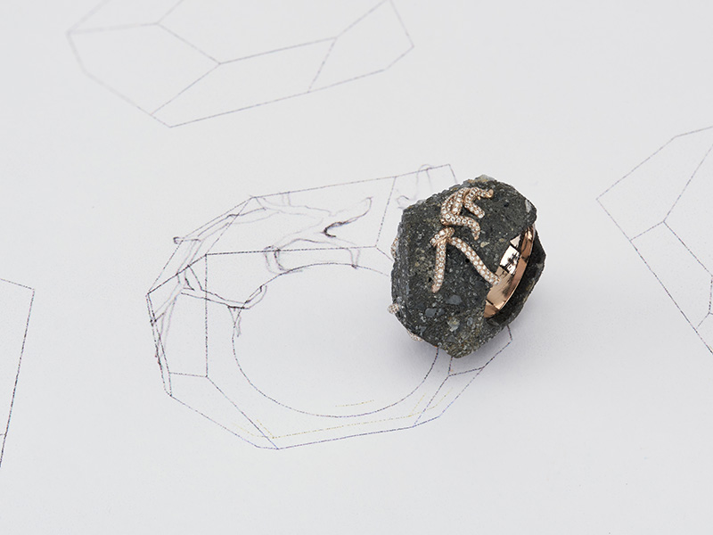 This year the fair pushes the envelope of art and design with the inclusion of a jewellery studio. Juxtaposing diamonds against discarded wood, acid treated concrete, limestone blackened and greyed gold, the studio redefines the conventional notion of jewellery into a well sculpted wearable art. Titled as ‘Material Studies,’their latest collection gives viewers an insight into a material-agnostic approach towards design and the process behind it. “Our works are physical manifestations of ongoing creative explorations and dialogues. Artists and other creative hands and minds are part of our creative consciousness”, shares Rahul Jhaveri, who is one half of Studio Renn.