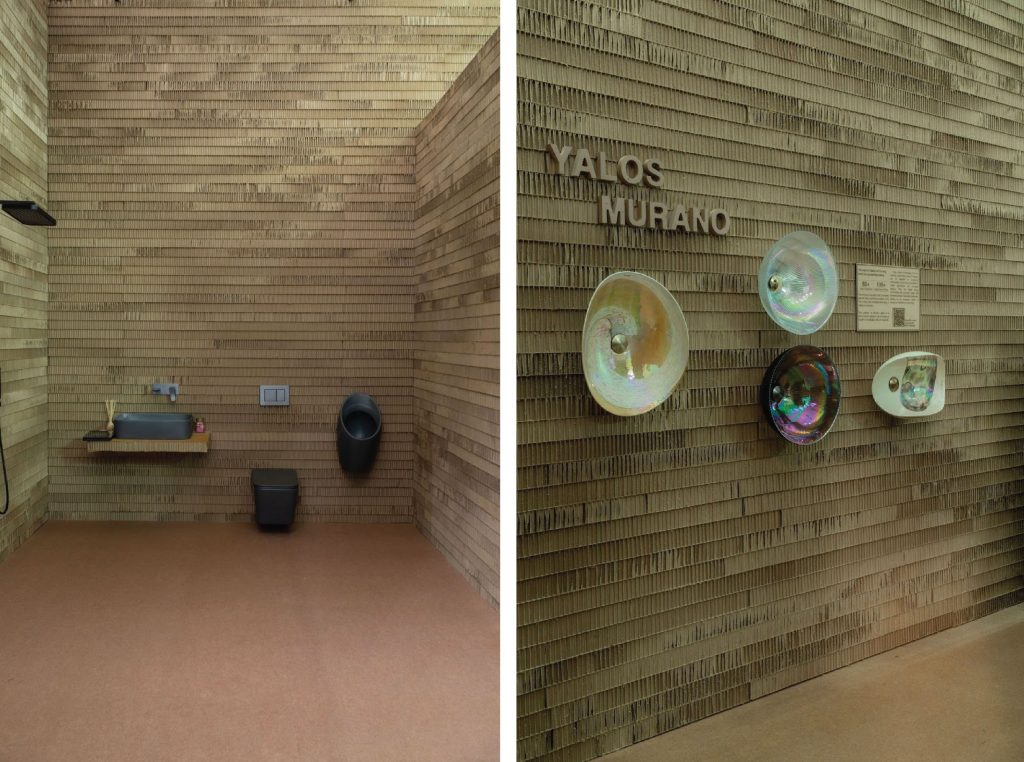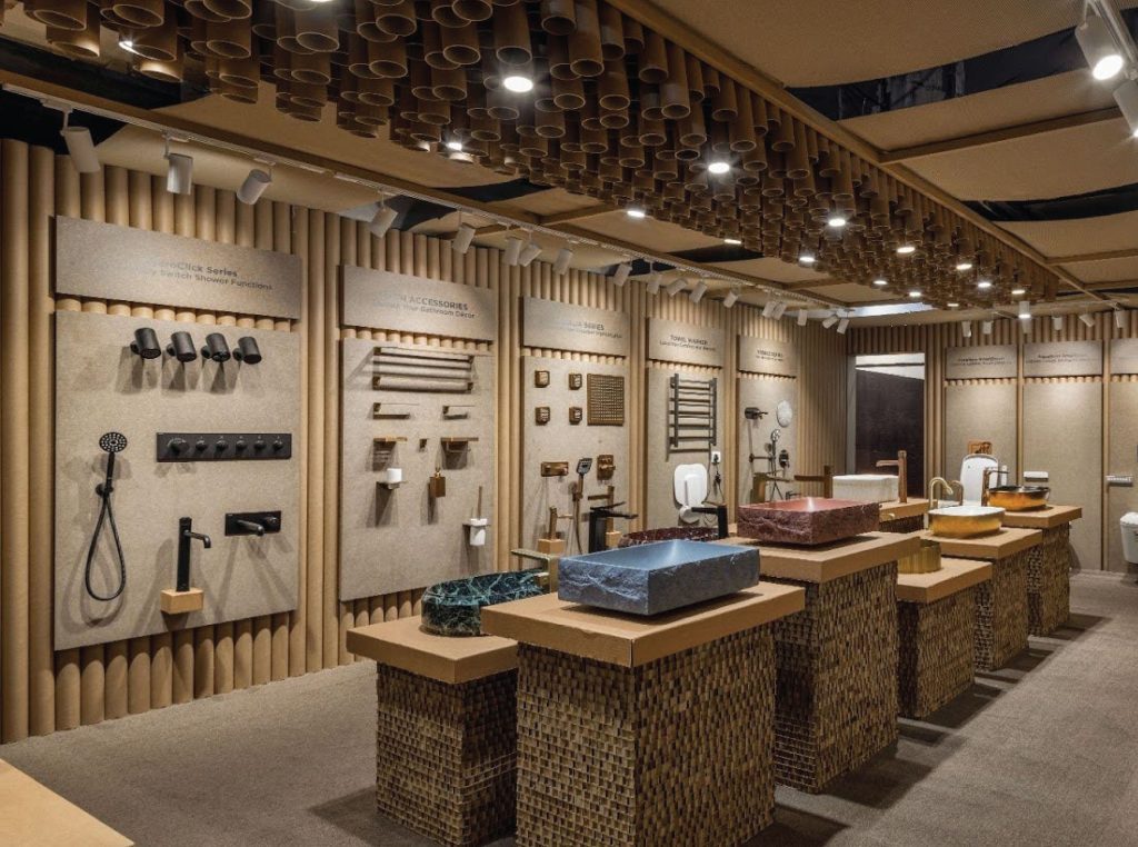The design was rooted in minimalism, guided by the idea that the product should remain the true protagonist. Cardboard, with its warm, natural tones, was chosen not just for its sustainability and cost-efficiency but also for its ability to create a subtle, neutral canvas. Against this monochrome backdrop, Aquant’s ceramic and metallic finishes materialised with vibrancy. Vertical paper tubes conferred a sculptural cadence while corrugated sheets above established visual continuity and coherence. Their booth was crafted entirely from recycled and eco-conscious materials, making a statement that sustainability and striking design can converge. This booth was nominated as a finalist at the World Architecture Festival (WAF) 2025, underscoring Aquant’s position as a brand that can push boundaries where luxury, design, and consciousness can intersect.