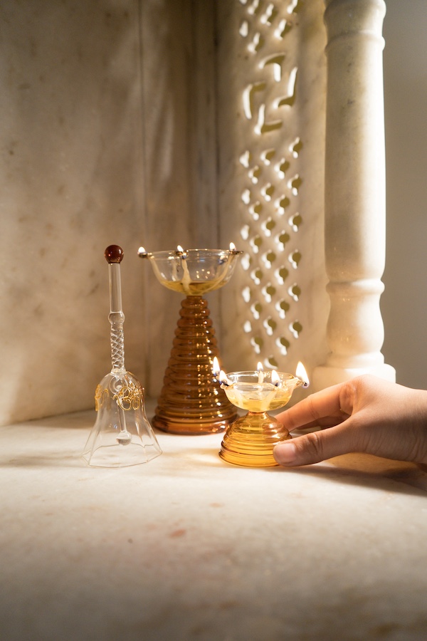 Muun Homeโs quest to redefine Indian craftsmanship lies in integrating contemporary global trends, crafting products that honour the heritage and embrace modern aesthetics with designs deeply rooted in heritage and refreshingly modern. โThe idea of the brand is to create and blend Scandinavian and European concepts with the Indian culture and our heritage,โ Jayant reveals, underscoring the conceptualization of each piece. Their glass โDiya,โ perfect for this festiveย season, is sturdily crafted from borosilicate and embodies this vision of fusion. As Talwar describes, โIt’s something like glass, but it’s stronger,โ talking about the reimagined diya. Referenced from traditional brass diyas, these minimalist glass objects seamlessly fit within a contemporary Mandir aesthetic. This harmonious blend of tradition and modernity elevates the diya into a timeless symbol, where the rich essence of Indian culture subtly intertwines with global influences.