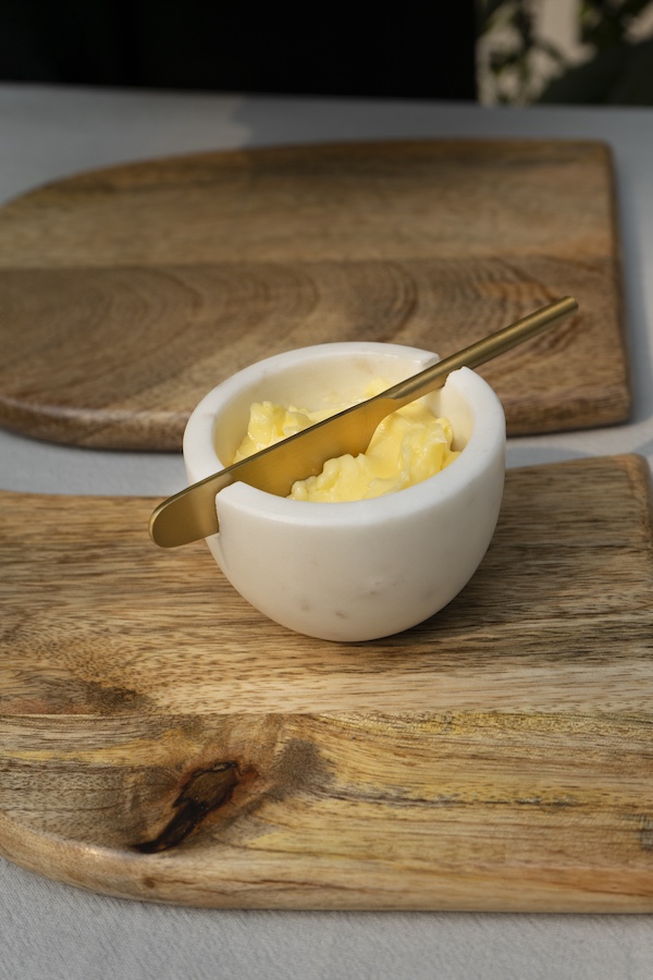 The brand displays a profound reverence for sustainability, seamlessly aligning with contemporary trends while honouring ethical craftsmanship. Their commitment is palpable in the ingenious use of waste materials, from exploring packaging made of reclaimed straws to integrating recycled materials into new products. This commitment is further underscored by their exceptional marble production in a fair trade-certified unit, a rarity that sets them apart. This trade is reflected in the sturdy marble butter dishes, crafted from white and dark grey marble, exuding panache. The skilled artisans in India handcrafted each dish pairing it with a gold knifeโPVD-coated stainless steel for durability and food safety. This product reflects a commitment to sustainable craftsmanship, blending traditional techniques with modern design to offer a timeless, eco-conscious product.