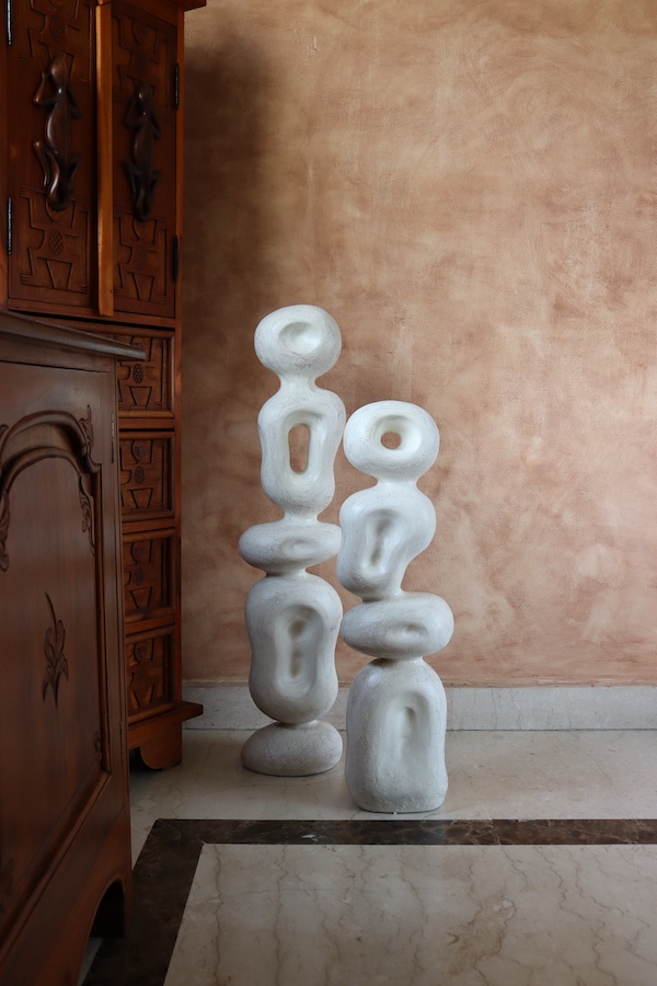 In addition to their collaboration with artisans in the countryโs most remote regions, Muun Home also partners with artists and other brands. Their association with the artist Divyendu Anandโa renowned Indian sculptor and a designer for Michael Aram for about 25 years led to the fabrication of a series of hand-sculpted, esoteric pieces. As Talwar revealed, โDivyendu wanted to express his ideas and expressions through different mediums creating pieces which would fit Muun Home, while having the soul of Divyendu Anand.โ The collaboration inspired the creation of the Kai bowl, crafted from marble dust and resin in Anandโs signature style. The collaboration also resulted in Ren sculptures, which portray mystical silhouettes of a man and woman. Crafted from fibreglass for robustness and exceptional heat endurance, these sculptures boast fluid forms, intricate textures, and a distinctive character, making them perfect for outdoor settings.