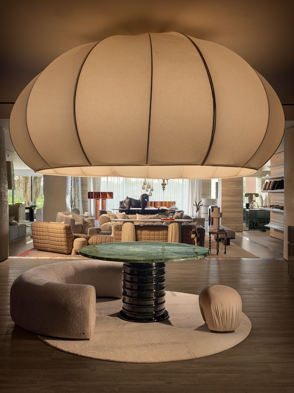 Inside the store, a foyer sets the table for the essential swank while subtly muffling the city’s flamboyant tones to welcome the guests into two distinct living spaces. Corralled by exquisitely crafted walls clad with a rich tapestry of materials—marble, wood, leather, glass, and veneer— this immersive outlet balances the syncretic assemblage of the homeware products. Embellished with essential appurtenances that glimmer under the Melogranoblu lighting, these living rooms set the essence for the narrative ahead. Scaling to the first floor, a motley of products designed for living rooms, bedrooms, dining areas, and more are perched on the Laminam floorings, posing for visitors and collectors. Here, the outlandish sculptures conspire with the furnishings and furniture, to orchestrate an ensemble that looks straight out of a whimsical fantasy. At the heart of this space, is a colossal pendant lamp spotlighting a signature marble table and a seating ensemble that offers glimpses of the interplay ahead.