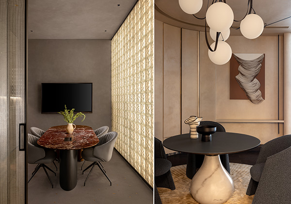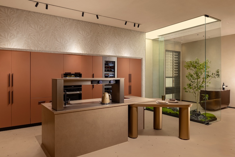 Adjacent to the model kitchens, the discussion rooms maintain a consistent colour palette of ebony and rose gold, equipped with a hidden alcove for finish samples. Also featured is a walk-in wardrobe that showcases the apogee in smart storage solutions with ample space, premium materials and innovative organisational systems. From concave walls to bubble glass bricks – the breakout areas create a soothing ecosystem. Buoyed by the success of their kitchens, the brand has adeptly diversified into vanities and wardrobes. Küche7’s vanity units combine organic shapes, floating forms and backlit mirrors with contemporary elegance.