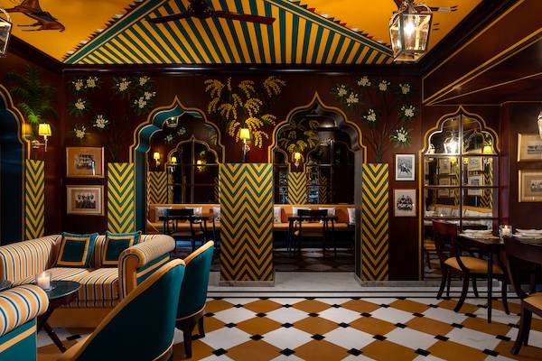 “Our style, since initially opening Bar Palladio Jaipur back in 2013, has always believed in colour and pattern” remarks Marie-Anne Oudejans, the Dutch visionary who designed Polo Palladio Jaipur. “I would not call this style a maximalist, as maximalism generally believes in clash or a juxtaposition.” Doused in a heady immersion of chevron, floral geometry and royal family hand-me-downs, this latest addendum to the storied Rajasthan Polo Club unfolds like a dreamy caravanserai. Never straying far from the club’s imposing history, Oudejans was keen to introduce a series of fresco oil paintings in her visual language. “Painting is the heart of the Palladio aesthetic and we wanted this project to have something more formal, more old world,” she explains. When we talk about history it was all the memorabilia that made this project so fun and helped ground the design, giving the fantasy a character and a sense of place.”