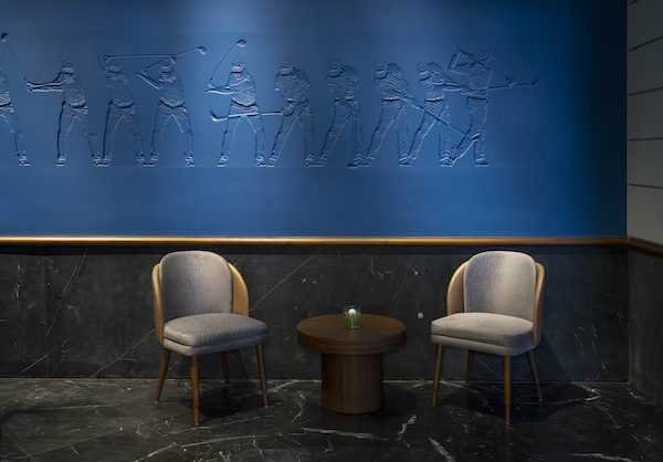 To offset the counter’s size and maintain its cutting-edge allure, Bihani incorporated a soothing shade of Pantone Classic Blue from the ironically tumultuous year of 2020. Also featured here is a blank wall adorned by a relief depicting the perfect golf swing. This heartfelt tribute is appreciated by its clientele as an endearing, positive affirmation.
