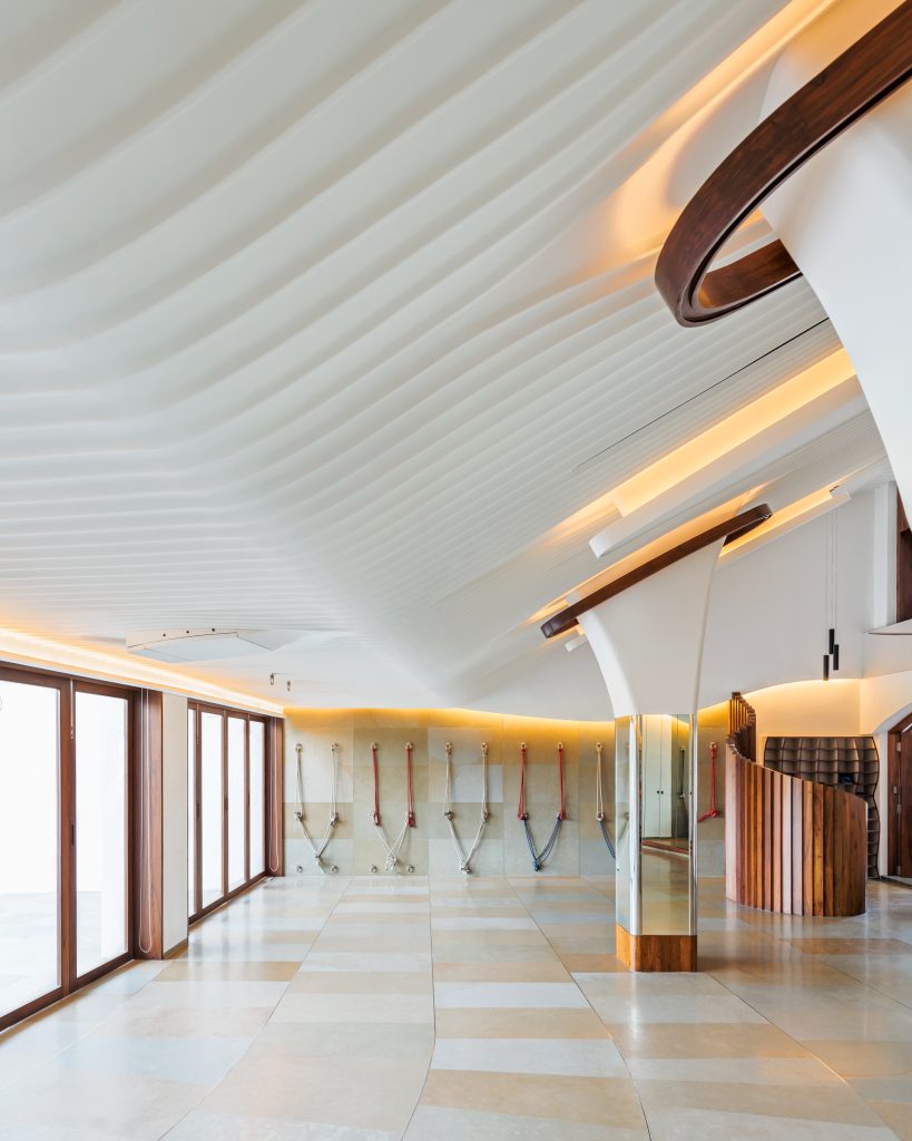 Beneath the bleachers of Brabourne Stadium, India’s first permanent sporting venue dedicated to cricket, Sethi has discreetly refurbished an Iyengar yoga studio for CCI that was long overdue for a facelift. “The overarching design element in the yoga room is the ceiling,” the principal architect elaborates. “You have these fluted POP grooves in a force-field pattern that part to accommodate the columns.”