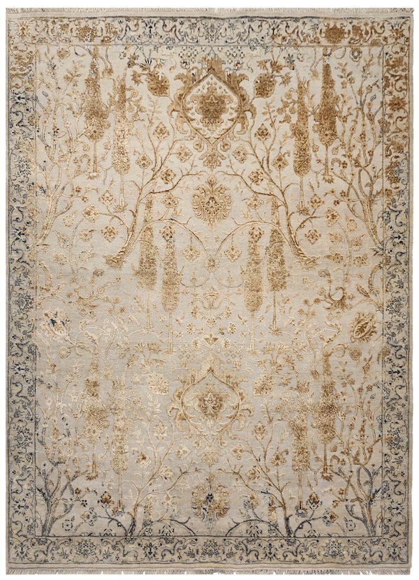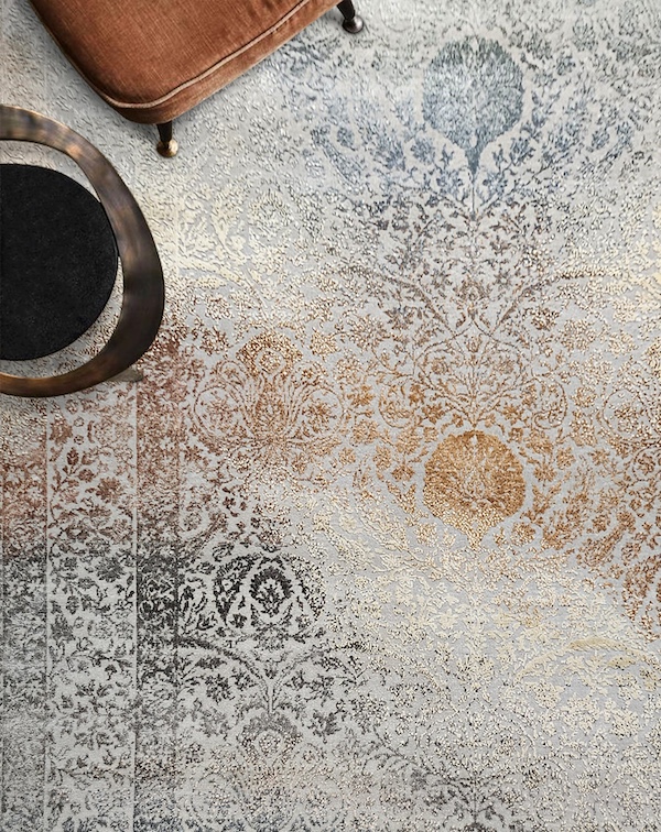 On the contrary, the homegrown brand’s multi-generational legacy, and the enduring artistry of local craftsmen pay homage to the looming cultural heritage. This blend is tactile in their ‘Transitional’ collection borrowed from the visual language of bygone Persia. These rugs are a fresh take on vintage aesthetics with contemporary colours and partially erased motifs that complement both the traditional and modern interiors. Khanna further explains, “All the traditional motifs like florals, medallions, etc. are still present but simplified or stylized differently.” While some of the pieces sparkle with gilded, dual-toned accents that enhance their cross-cultural appeal, others revive the soft arabesques and vivid hues that are an ode to the generational craft of Bhadohi weavers. “They are handcrafted in the finest materials, (in) the age old hand-knotted way but are now considered heirloom pieces to pass on through generations due to their timeless appeal,” points the founder.