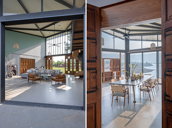 A lakeside holiday villa in Kamshet designed by Ar. Shonan Purie Trehan from Labwerk. SAR Studio’s Blue Loft sofa and lounge chairs envelop a central table crafted by GOMAADS under the design direction of LABmake. Riddhika Jesrani’s styling welds intuitively with the organic palette. (Image credits: Kuber Shah)