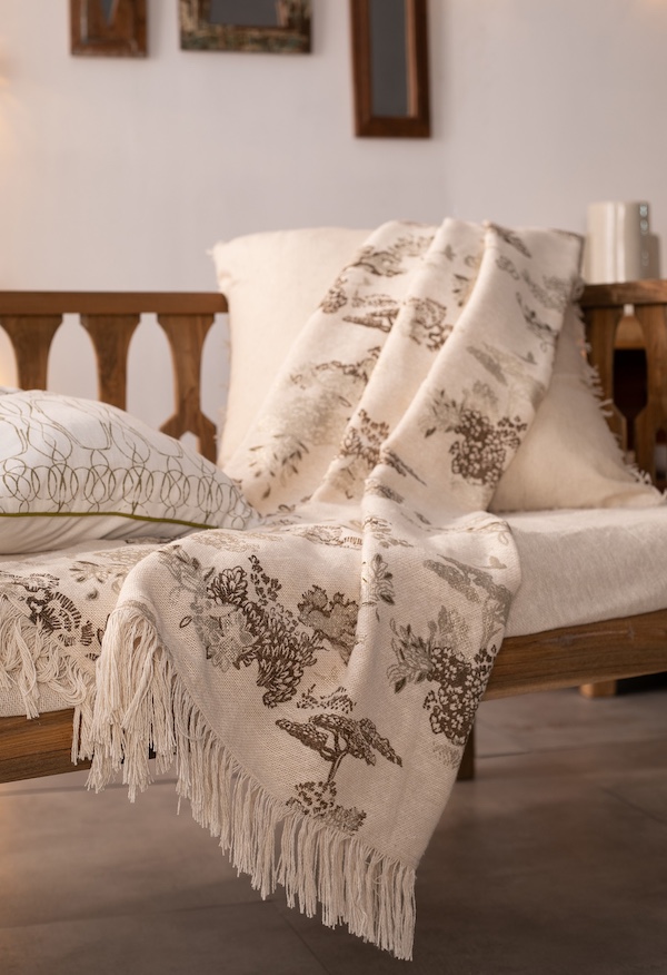 Rendered in warm neutrals and made of high-quality loose weave cotton, the ‘Wilderness Song’ throw from Freedom Tree Design Studio is a poetic celebration of nature’s beauty. A serene beige canvas is brought to life with the emergence of new leaves in a budding forest, symbolising rebirth after winter’s slumber. Gold leaves are infused using the screen print foil technique. The throw is lightweight yet cosy, making it perfect for year-round use. It can seamlessly blend into a variety of interior styles, from bohemian to contemporary chic. Drape it over a neutral-toned sofa or layer it on a bed for a subtle hint of nature-inspired elegance.