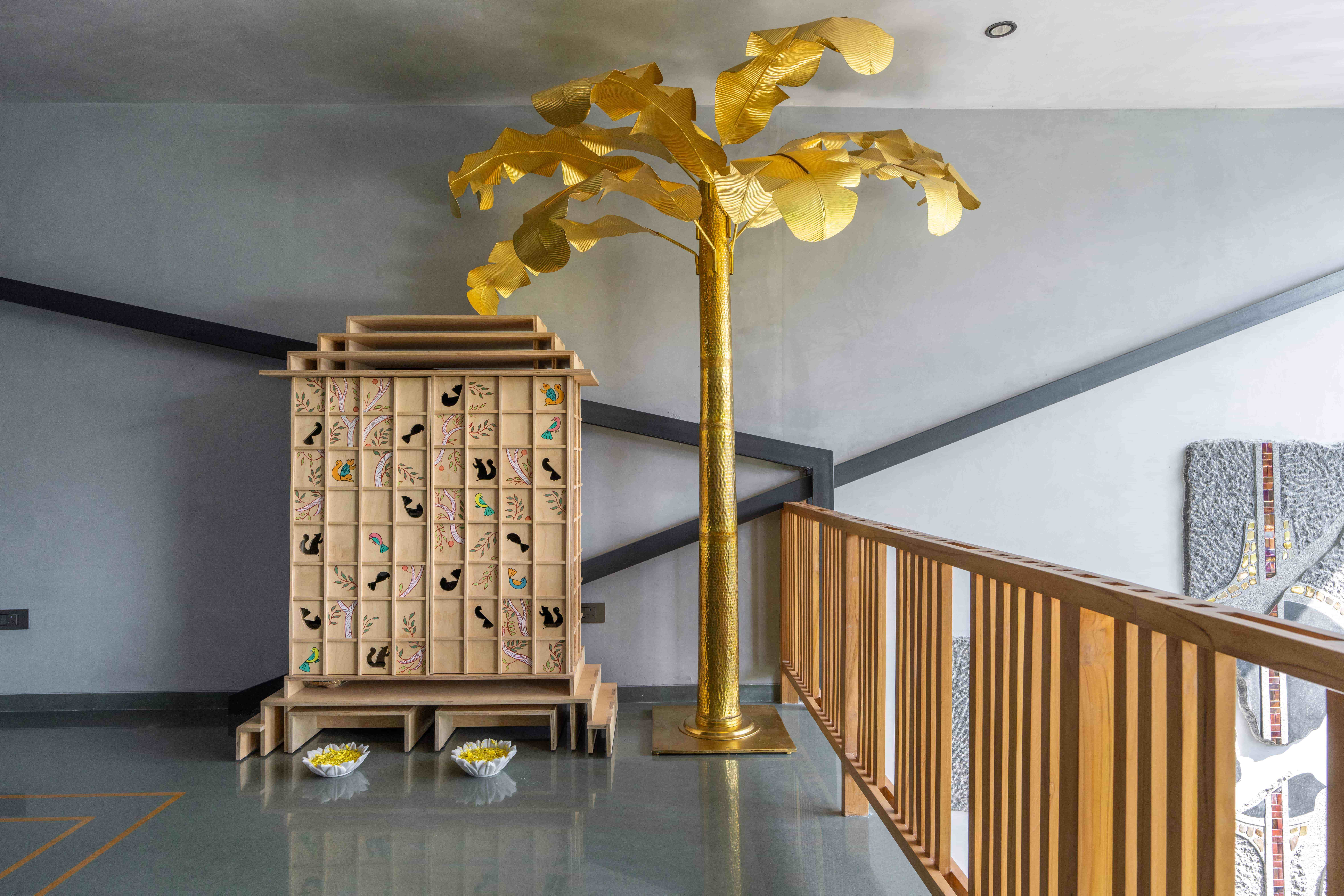 This devotional jewel by Onedot6, led by Creative Directors Aamir & Hameeda is inspired by the quiet elegance of Japanese temples. Reimagined for an Indian home in Hyderabad, the mandir is made entirely in birch ply. Its surfaces are defined by clean lines, playful cutouts, and a mix of hand-painted vignettes of birds and foliage. These details introduce color, depth, and storytelling, seamlessly blending artisanal craft with modern geometry. A golden tree with gleaming textured leaves rises alongside, creating a dramatic focal point that contrasts beautifully with the understated wooden form. Lotus-shaped vessels with flowers at the base further ground the mandir in Indian ritual and symbolism. Ample natural light filters in from the adjoining double-height glazing, while subtle ambient lighting ensures the mandir glows softly in the evenings, enhancing its spiritual presence without overwhelming the interiors. Both reverent and exuberant, the mandir becomes a striking centerpiece on the first floor.
