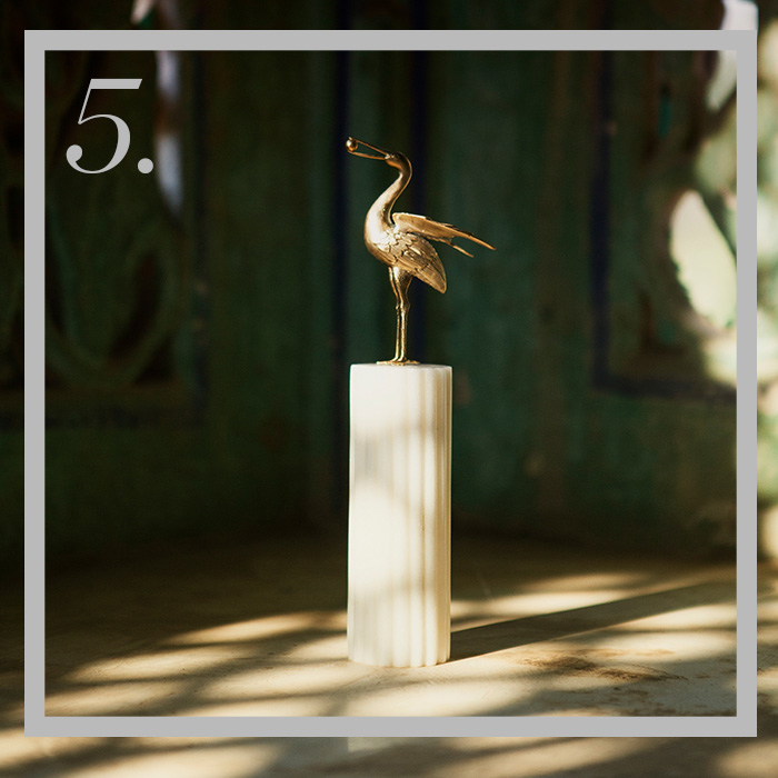 Unlike marble, soapstone is non-porous, so it doesn’t absorb liquids and is highly resistant to staining. This chief distinction makes this material — in many other ways similar to marble — a more fitting choice for tableware, home décor and accent pieces that are usually placed in high-traffic areas of your home. Heron Column by Ira Udaipur will add an understated, rustic charm with a surprising touch of heritage flair. The brass heron on a pedestal with its polished golden sheen, exudes a sense of regal grace.