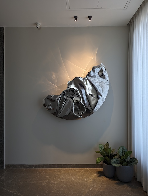 Characterised by undulated reflective surfaces and cosmic inspiration, the Crescent by Gurugram-based designers Nitush and Aroosh is a quintessential intergalactic fixture. Crafted from stainless steel and measuring 150 cm, this striking piece captivates with its dynamic interplay of light and shadow, casting caustic reflections reminiscent of moonlight dancing on the ocean. More than a mere wall sculpture, it merges terrestrial tranquillity with extraterrestrial allure. It transcends functionality, serving as a light fixture and a work of art. Incorporating the Crescent into your interiors means having a centrepiece that effortlessly commands attention and brings a harmonious balance of contemporaneity and innovation.