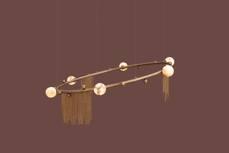 One O One Studios, known for its quirky and character-filled designs, introduces the Shooting Star chandelier, a unique creation by visionary designers Yasha Mehta & Hiren Ganatra. This made-in-India light fixture features onyx globes and delicate gold chains gracefully suspended along the rim, imitating the trails of a shooting star. It combines stainless steel, antique brushed brass and gold accents with an adjustable height to fit perfectly in any space. Embracing the intergalactic trend, this exquisite luminaire can transform your space into a whimsical starry haven, as if you’re gazing up at an orbit of fragmented meteoroids.