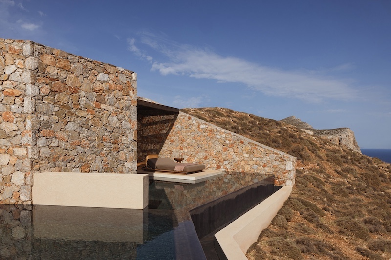 Step outside, and each room flows into a private heated infinity pool that offers unobstructed views of the sparkling blues of the Aegean. All the suites and villas guarantee privacy, while the deluxe and superior cave suites are subterranean and are positioned at a dramatic cliff edge that exudes true disconnection from the world. Acclaimed Athens design studio, Block722 takes cues from the Cycladic design aesthetics. Each suite and villas feature handcrafted timber furniture, marble floors, and natural rustic textures casting an overall palette of earthy browns — a break free from the typical white-washed tone of the Greek villas. Â