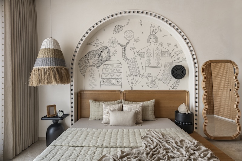 The daughters’ shared bedroom is a delightful combination of whimsy and functionality. Arched headboards, adorned with playful black spheres, create a focal point, while quirky line drawings by Rogán Designs capture the sisters’ unique personalities. Cane cone pendant lights cast a warm glow, and the wardrobe’s geometric square pattern of wood and cane adds a touch of understated elegance. A clever sliding panel transforms the study area into a dressing corner with a mirrored surface, maximizing space and adaptability. This vibrant yet serene space, with its use of natural materials like wood and textured lime plaster, fosters creativity and comfort for the young occupants.