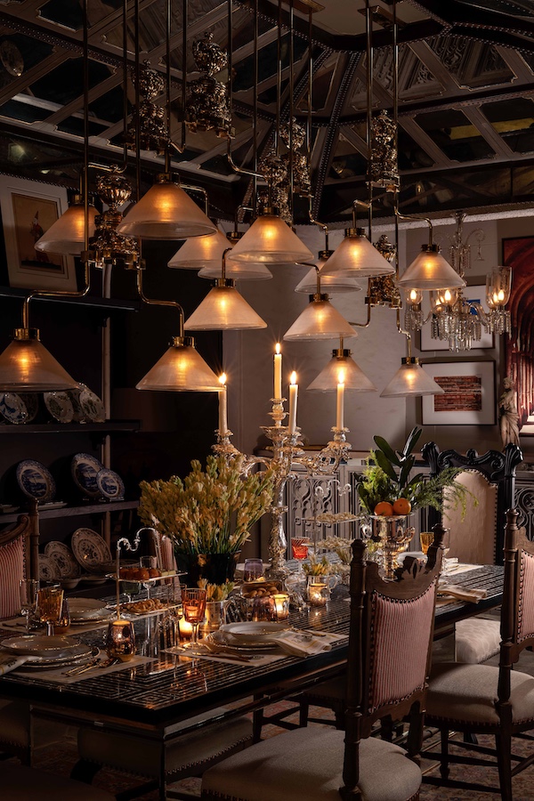 Illuminating the table is a key expression of the festivities. Picture a table suffused in an ethereal glow, adorned with an exquisite array of candles, from slender tapers to lofty pillars, all nestled in chic holders. The gilded pendant lights from Beyond Designs, diffuse a soft glow on the entire table setting.