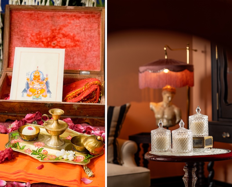 The harmonious combination of traditional ‘diyas’ from Indian Heirloom Co. and Studio Zimik’s scented soy candles, casts a mystical glow, illuminating the gathering with a warm radiance that embodies Diwali’s allure. This radiant display, snuggled in opulent, handcrafted diya holders of polished brass or etched glass, drenches the space in a plush, inviting ambience. The flickering flames enhance the warmth of the tablescape while the candles infused with opulent sandalwood and delicate jasmine notes orchestrate a sensory experience with the table setting.