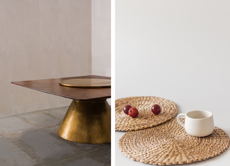 Begin by choosing a hand-crafted dining table like the one from Rhizome’s Mathaar collections which blend rustic with brass accents, adding a touch of heritage. Enhance the aesthetic with vases from Studio Abaca, Muun Home’s Kai Organic Bowls and dual-toned wooden plates, to complete the enchanting cottagecore setup. Alternatively, you could deck up your table with an array of natural textures; like wicker placemats and coasters from Studio Kolus and table runners.Â