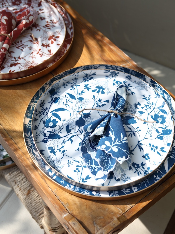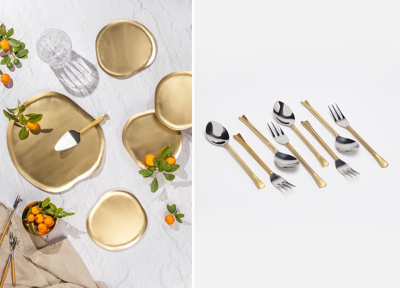 These lustrous accents, whether as brass cutlery from Gado Living, glimmer beautifully under festive lights, creating a radiant yet layered aesthetic. The brass trays and candelabras from Viya Home serve as the table’s centrepiece, adding a touch of sumptuousness and tying the entire setting together.