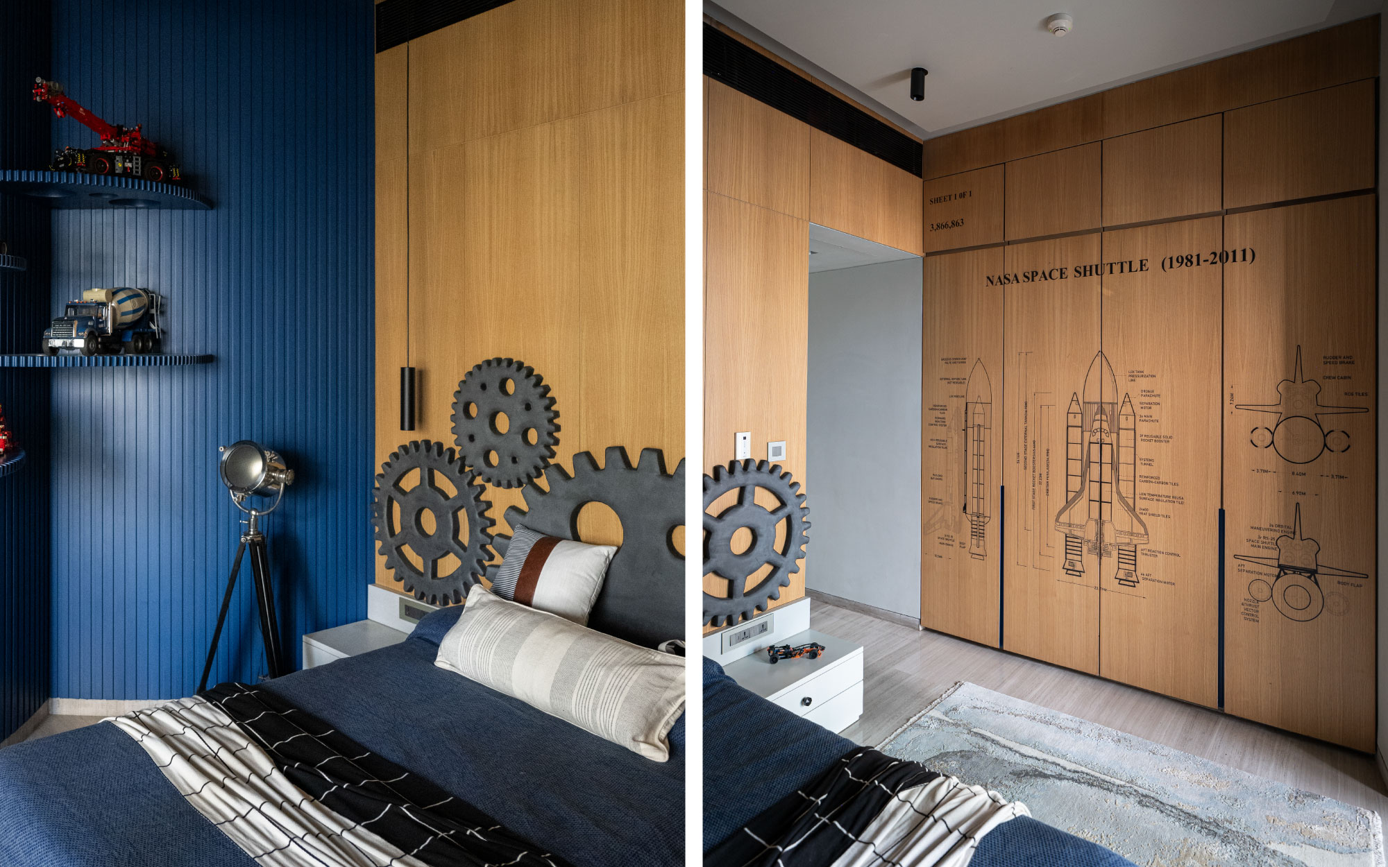 More than a place to sleep, the bedroom is designed as a zone of identity, one that depicts the teenager’s personality and aspirations. A highly-stylised study nook integrated into the corner of the bedroom, offers a focused workspace that seamlessly carries forward the room’s bold, powerful theme. The wardrobe too, becomes a didactic canvas, etched with technical drawings of the NASA space shuttle. This reference to mechanics is not literal but interpretive, capturing themes of speed, curiosity, and rebellion, qualities that resonate with the restless and adventurous spirit of a teenager.