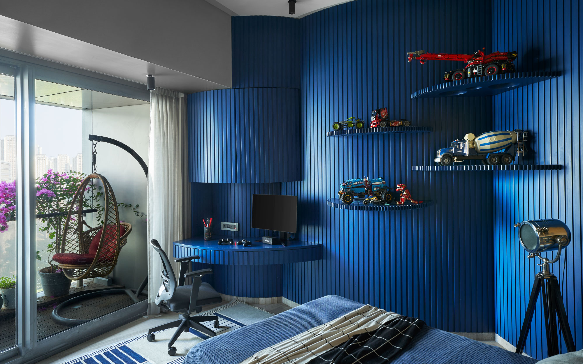 Principal Designer Shimona Bhansali of DesignHex, dignifies youthful obsessions by designing a maximalist bedroom in Mumbai for a teenage boy; a space that speaks of velocity, technology and a fascination for the engineering world. At the nucleus of the design is a deep, matte blue PU finish that swaddles the cantilevered walls. To heighten the impact, the space is imbued with industrial cogwheel motifs and metallic accents. The automotive toys, like rugged off-roaders and construction trucks are showcased as accolades on the shelves, injecting a sense of motion and energy.