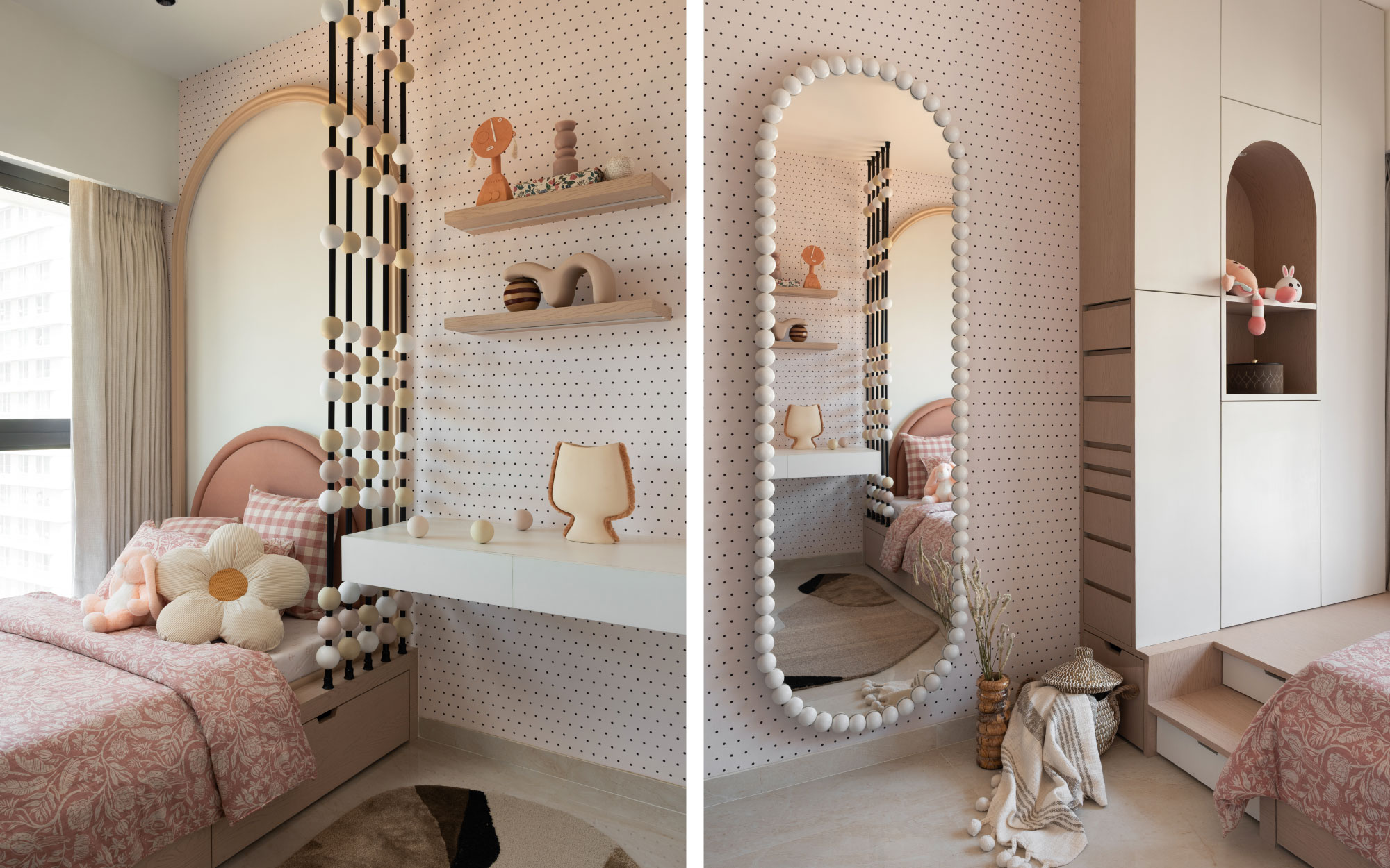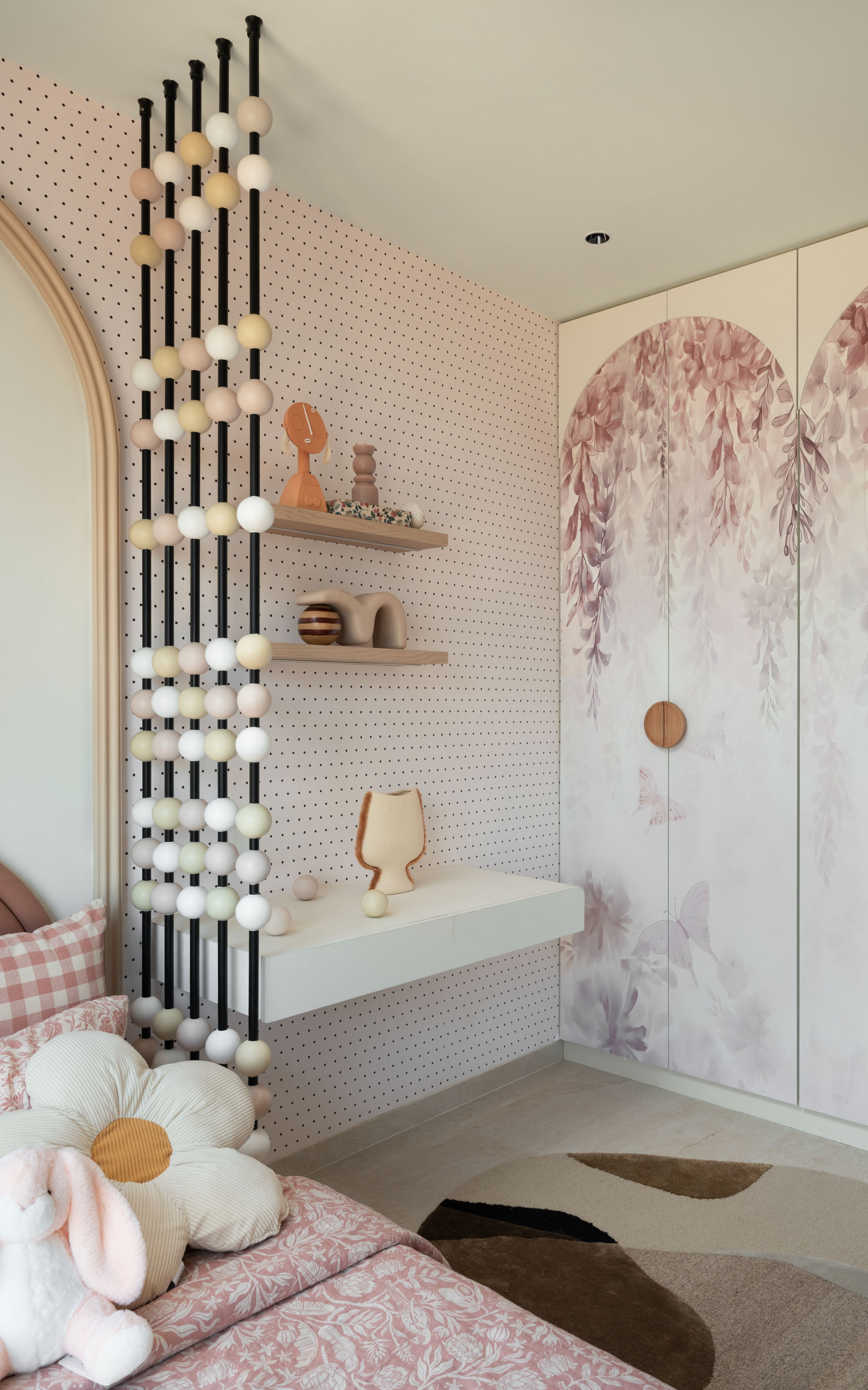 A youthful dreamscape in a Mumbai residence that oscillates between whimsy and reverie. Principal Designer Rohini Bagla of Studio Rohini Bagla crafts a serene bedroom for a teen girl that pirouettes in polka dots and storybook charm. It is a kaleidoscope of delightful oddities stitched together with playful furniture like the step-up bed, offering elevation and an elongated mirror that insists on having its own personality. The walls adorned with custom polka dot wallpaper provides a sense of cohesive and buoyant rhythm. The gentle arch recurs as a leitmotif throughout the room, curving across the headboard, the cabinetry opposite the bed and the floral panels adorned on the wardrobe.