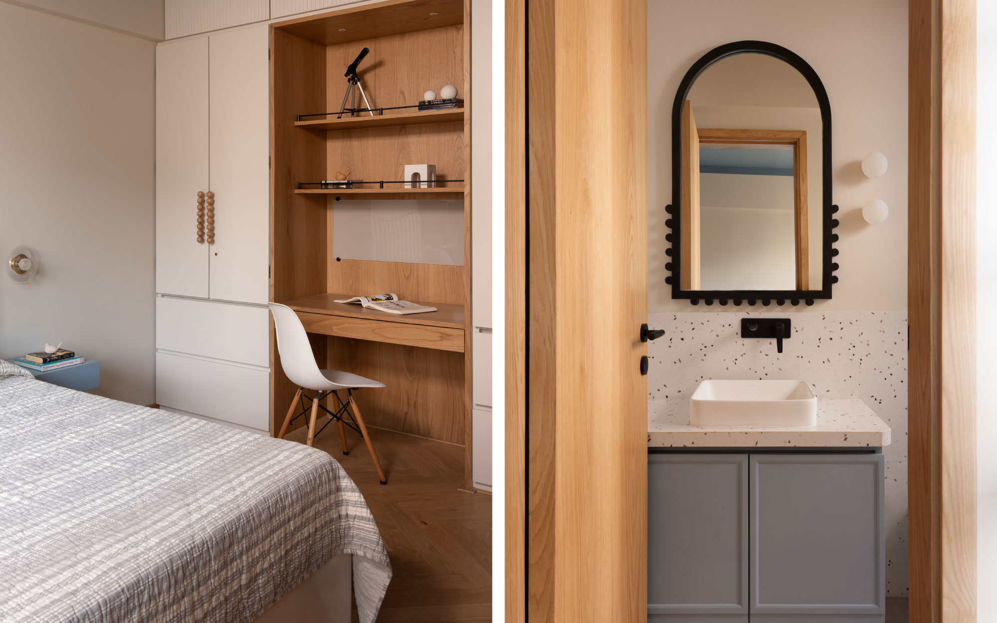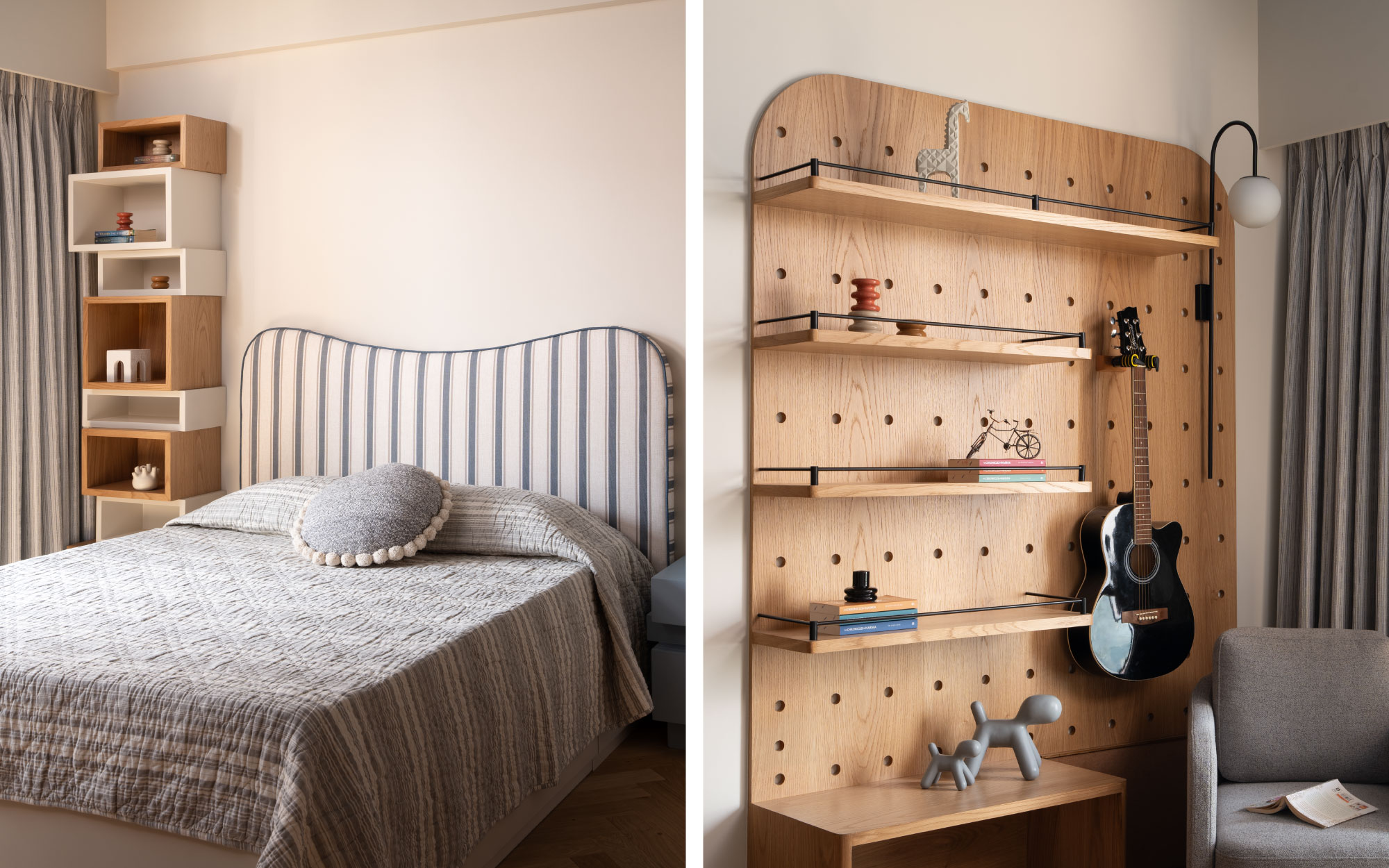 For a teenager, whose life is a constant confluence of academic materials and burgeoning hobbies, storage is imperative. To meet this need, the eminent designer has provided two quintessential storage units in this bedroom. On one corner is a custom staggered shelving unit made of alternating wood and PU finishes. This not only introduces a graphic, sculptural charm but also serves as a display for books, accessories, and personal collectables. The second is the pegboard wall opposite the bed, again a versatile showcase of changing interests, decor and even a prized guitar. Next to the bed, a neatly integrated study niche within the wardrobe provides a dedicated work zone. With the integration of natural materials and a calm colour scheme, this bedroom is a successful exercise in design judiciousness.