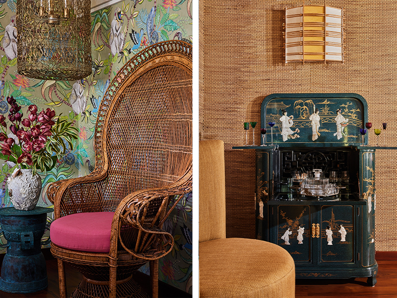 Yet another interesting piece is the Mustique Sedan Chair designed by Bill Sofield (sourced from McGuire). With an outer shell crafted entirely from a handwoven Danish cord, a generously sized loose seat cushion, and sleek walnut legs, this comfortable chair pairs well with the room’s cosy design.