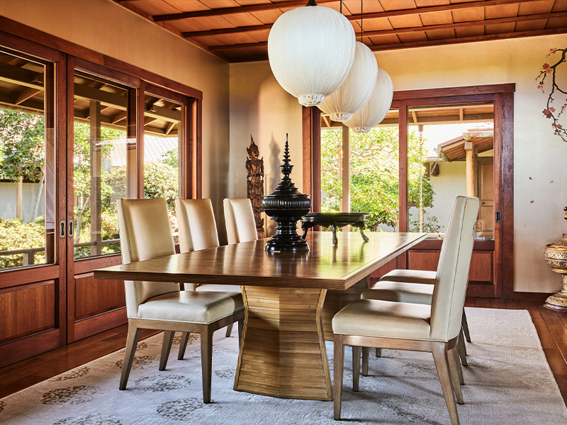 With lush courtyard views, the dining room is reminiscent of a floating tatami room. Here, a series of Asian antiquities like statuettes and objects inform the dining room’s cultural richness, as does the hand-painted mural of cherry blossom branches that adorn the canvas-panelled walls.
