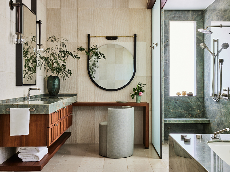 The primary bedroom’s bath, simply decked in a neutral tile, features a floating vanity, a sleek mirror and two glass globe wall sconces that bring in a sense of sophistication and style. Even as a sense of restraint prevails in this private sanctuary, there is an unmissable sense of uninhabited living. The bathroom brings in spectacular views of the Pacific Ocean as well as that of a secluded private garden.