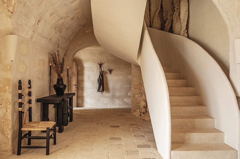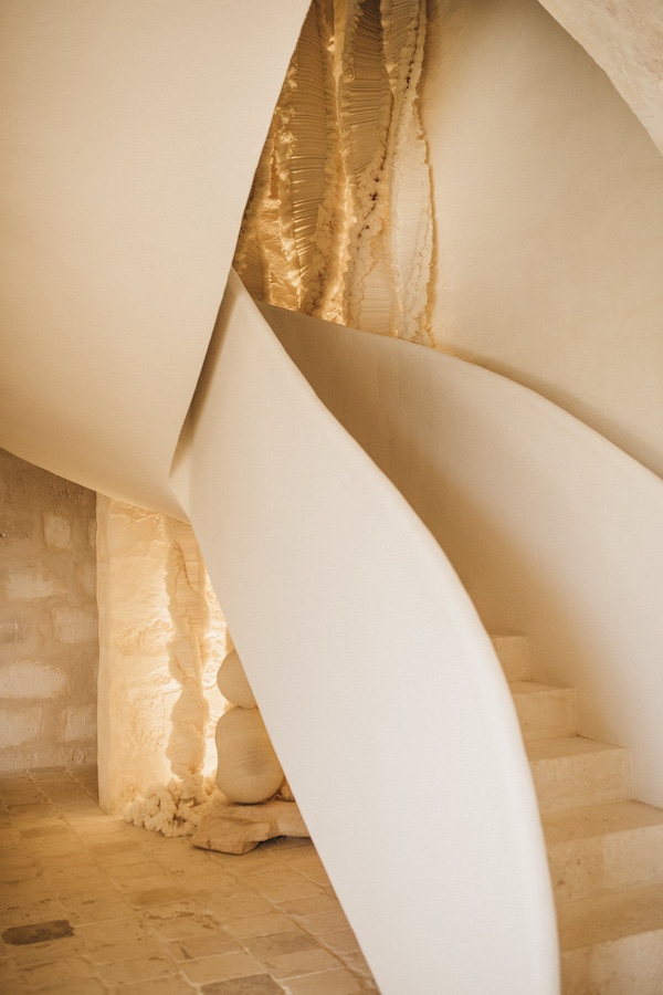 “The marés staircase is one of the most remarkable features of the house,” say the designers. “All in stone, its sinuous and organic ramp is the result of a collaboration between the ingenuity of Menorcan masons and the architect’s design.” A two-story-high textile work hanging at this staircase of the Finca from ceiling to floor was crafted by Perrine Rousseau known for creating astonishing silhouettes on a traditional loom.