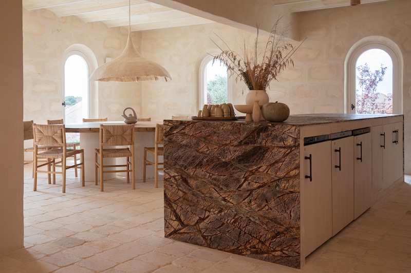Across the expanse of Son Blanc, textured walls blend with local marés limestone to create a coherence with the environment. The new walls were treated with plaster created in situ by Menorcan crafter-builders who together with Atelier du Pont devised various metal tools to create the textured plaster coating. “Like a comb, this accessory sculpts the surface into a fluted volume,” say the designers who worked in tandem with local architecture firm ARU Arquitectura to bring this project to life.