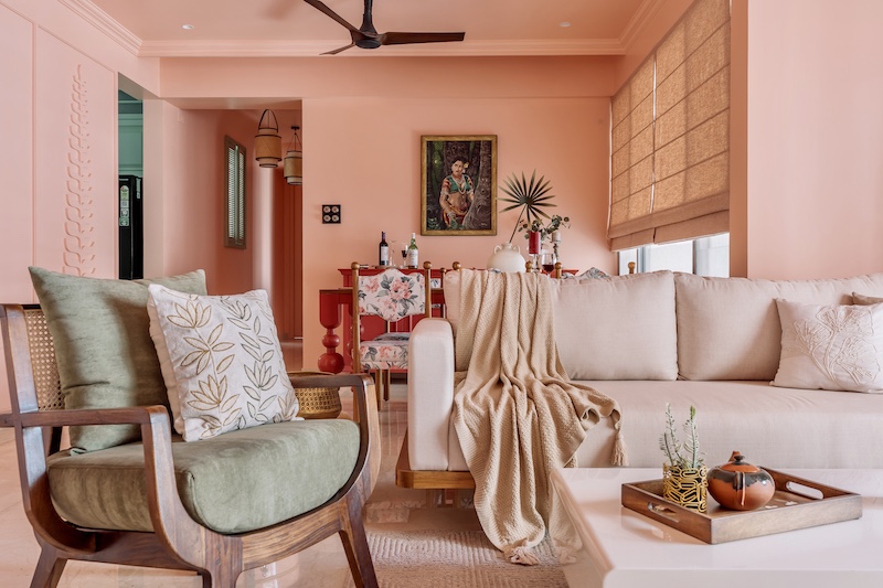 Cruising through the grey roads punctuated by occasional verdancy, Jade emerges like a breath of fresh air with a blush door, unveiling an entryway drenched in warm peachy hues. Paired with a classic wood-and-wicker console that anchors the space, it “draws from the city’s mix of tradition and modernity, creating a home that resonates with its cultural and cosmopolitan surroundings,” says Sakla. The vibrant tale of the Jade commences in its monochromatic peachy living room, embellished with bespoke wood and wicker furniture underscoring the traditional furniture-making craft. Peering over every conversation is a magnificent, panelled ceiling with intricate wooden frames that infuse a sense of warmth into the space. A gilded lotus sticker at the frame’s heart reflects the inhabitants’ penchant for a glistening touch. The architect further reveals, “One major challenge was balancing the clients’ desire for gold accents with the overall aesthetic, which was addressed through its subtle integration,” making an appearance even in the art-deco style wall scones.
