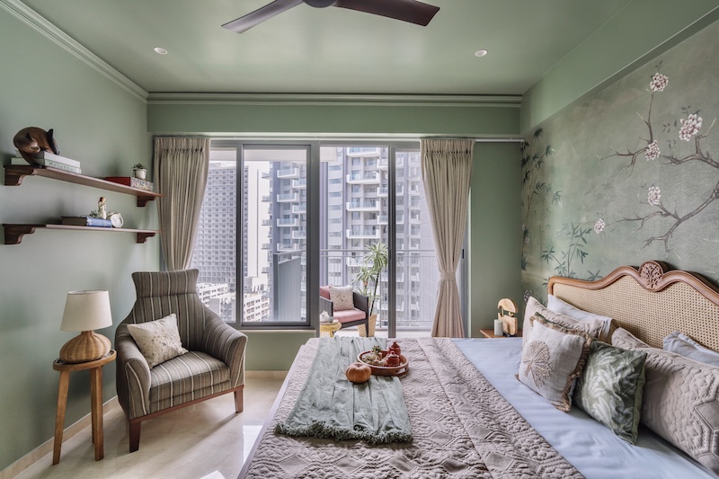 A softly glowing peachy passage, courtesy of the rattan pendant lamps, culminates into a serene, verdant bedroom with colossal windows that frame Pune’s bustling landscape while spilling out into an alfresco hangout space perfect for unwinding. With a feature wall whispering tales of Pune’s rich flora complemented by a wood and wicker bed, this minimalist retreat cradles a 50-year-old cherished wooden chair, proving that heirlooms deserve a stylist afterlife. “The reupholstering of a cherished 50-year-old armchair, gifted during the homeowner’s wedding, was seamlessly integrated into the new design while preserving its sentimental value,” shares Sakla. Opposing the bed, a sleek window stands as a silent advocate for sustainability, embracing the verdant bedroom’s essence, while fostering cross-ventilation and radiating the allure of a tranquil paragon.