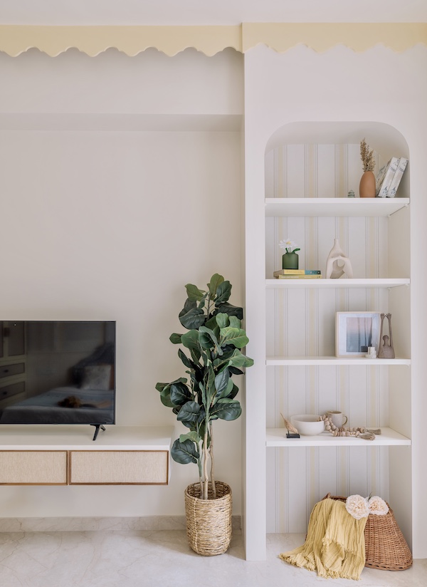 With clean lines and a clutter-free design, “regional elements are subtly woven into the design through the use of patterns, textures, and a vibrant colour palette,” Sakla explains. She adds, “(The) challenge was addressing the inconvenient height of the developer-installed AC sleeves,” which was tended with the air conditioning units’ ingenious integration into bespoke alcoves while preserving the home’s core design style. The result is a space that feels vibrantly genial while profoundly serene—an abode that wraps its inhabitants in warmth and comfort.
