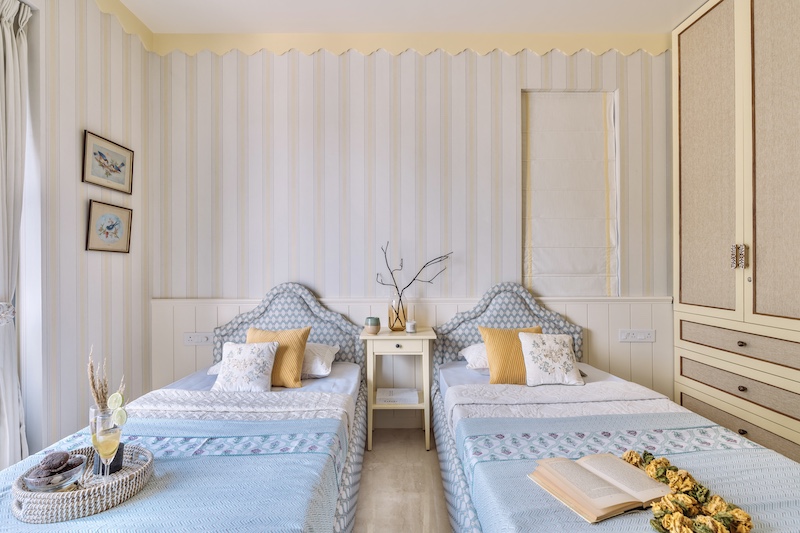 As vintage aesthetics experience a grand revival moment, this abode thoughtfully mirrors the vibrant aesthetic of every inhabitant’s bygone golden era, with a vivacious spirit that echoes in its design. Consequently, Sakla proudly reveals, “For the 90-year-old mother, her bedroom was designed with a warm, cottage-like ambience.” Basking in pastel yellows and honey-dew warmth the airy bedroom with its pinstripe (cottagecore’s essential archetype) feature wall paired with white moulding and printed upholstery beds. This space, dipped in the nostalgia of the multihued 80s reflects a delightful mix of inclusivity, with “rounded furniture edges for safety, and accessible furniture for daily ease,” Sakla quips, referring to the matriarch’s bedroom that mirrors a countryside retreat.