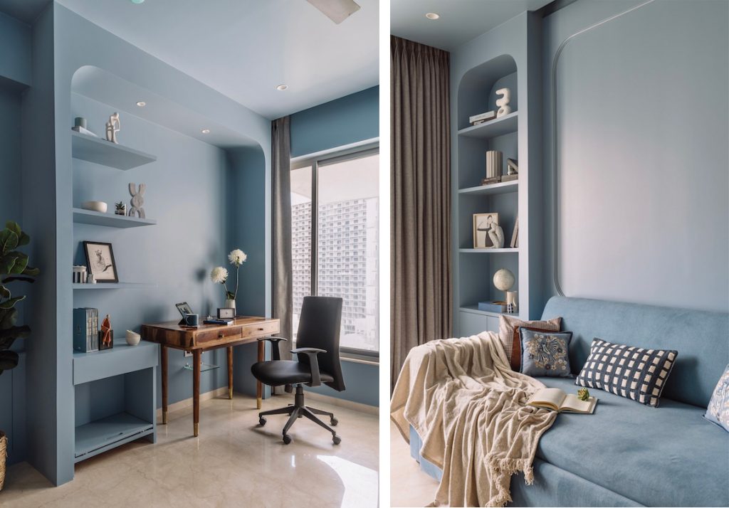 Drawing on the sky’s mesmerising tints, the study transpires, perfectly crafted for long hours of focused work. The clients coveted distinct spaces tailored to their personalities and needs, as they both work from home. With blackout curtains, bespoke niches for books and files, and a custom-crafted table from Lakkadhaara, the study metamorphoses into a chic haven where impetus and panache co-exist. The voluptuous niches exude a sense of depth within the banal room.