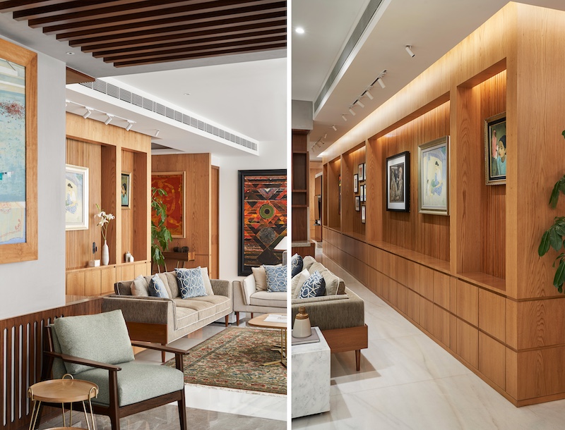 “The expansive glass façade of the apartment limited our ability to showcase the client’s extensive art collection. All large apartments, because of the lift core and staircase, have a dead RCC wall you need to work around. This apartment came with a 35-feet RCC wall, and so we designed this as a stunning veneer wrap with slats to allow the client’s collection to take centre stage,” says De Rooij who also carefully designed spaces throughout the home to offer optimal vantage points to admire the works of art. Â