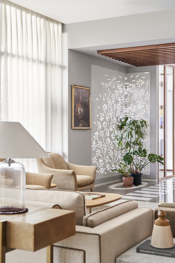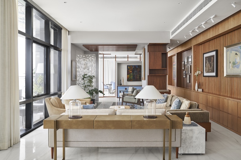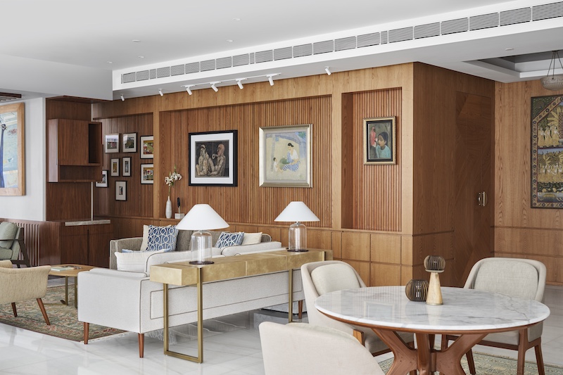 A newly designed apartment on Altamount Road, widely known as Mumbai’s Billionaires’ Row, is a 5,000-sq-ft haven of both contemporary and classic postcolonial touches. Home to a prominent industrialist with an extensive art collection, the sea-facing apartment dubbed Altamount Abode is akin to a gallery with various spaces designed to display the client’s extensive collection and to soak in works of art from various vantage points. Having designed the client’s office, Lara De Rooij, partner and principal architect at LMC Architects, was keenly aware of their need for a fluid and functional layout. The other part of the brief was for an elegant home that would remain timeless for the next 25 years.Â