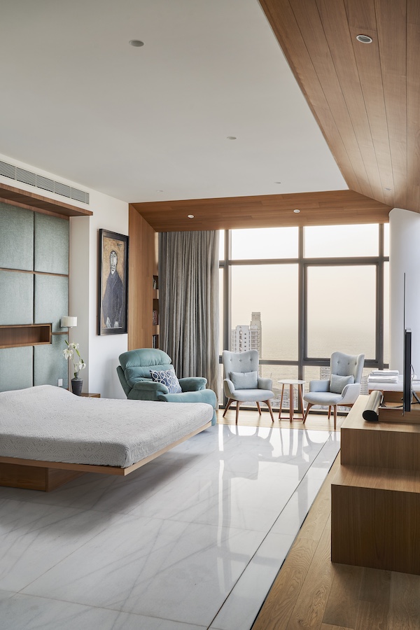 Inside the home, an oak wood veneer wrap serves as a unifying element that guides and leads one into an array of semi-private, seamlessly interconnected spaces. Flanked by the Arabian Sea, the apartment offers the ultimate amalgam of panoramic views of the city, unhindered natural light, and waterfront views. By opening the apartment to a vast stretch of the northern façade, the living and dining areas are swathed in natural light. “We designed the common spaces such that the entire north façade is opened for its views and so that the house is flooded with natural light. The north façade has views of the sea and Mahalaxmi Racecourse. The southwest overlooks Marine Drive with views extending up to the eastern waterfront,” De Rooij explains.Â
