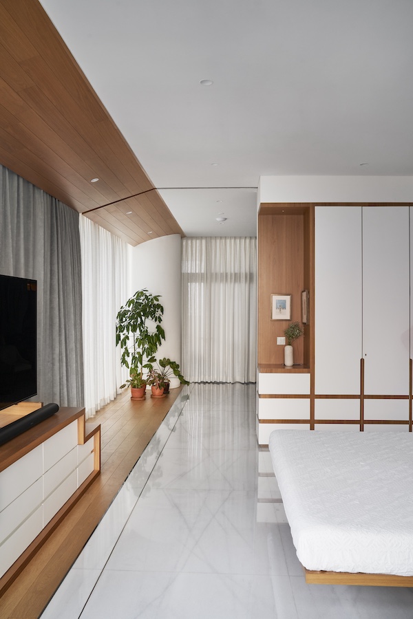 A nifty sliding door bridges the living area and another semi-private space—the den. The den was designed to be part of the living space to accommodate larger gatherings when required. To this end, LMC Architects integrated a receding wooden-wrapped wall with a gradually decreasing ratio to allow for a staggered wall that gradually reduces in size, with the last two divisions of the wall serving as a sliding door.Â