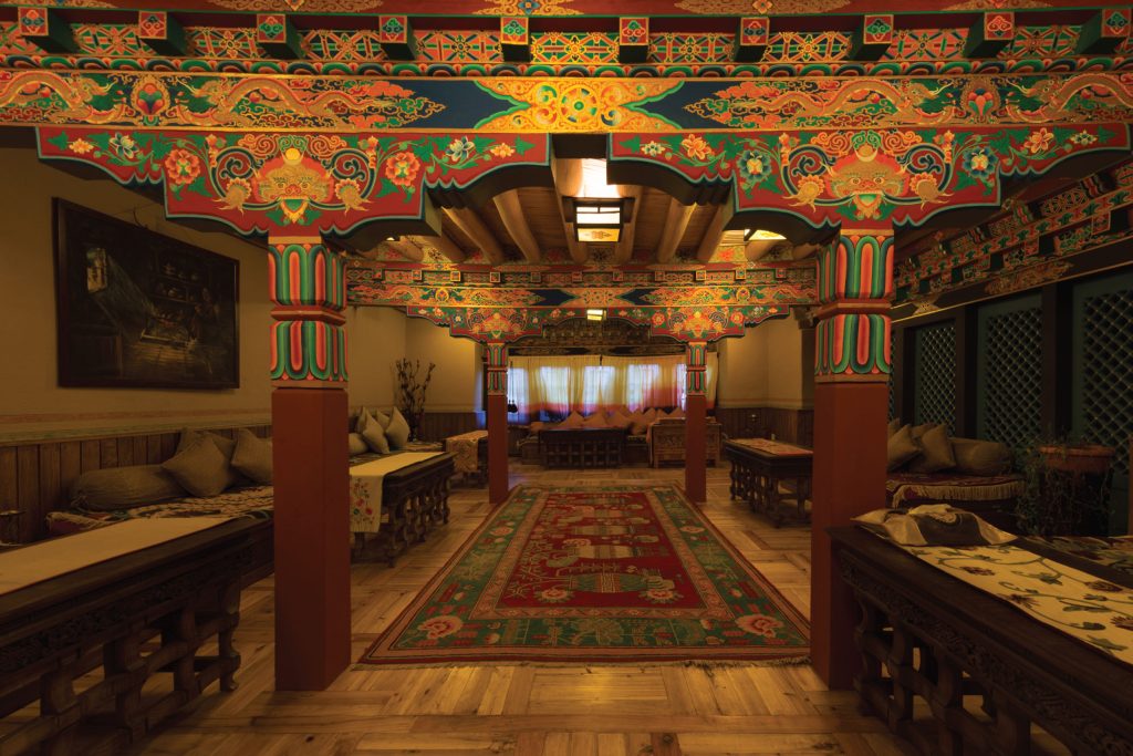 Set majestically atop a hill overlooking the Indus River valley, the Stok Palace is the 200-year-old residence of the Namgyal dynasty in Leh. Now the five-storied boutique hotel comprises four standard suite rooms, one royal suite, and the queen’s room. The rooms are spacious with balconies overlooking the Stok Kangri mountains and the expansive valley. The colourful rooms are donned in murals on secular and religious themes and Ladakhi textiles and furnishings. Each space defines its heritage architecture which blends beautifully with contemporary comforts. The stately palace showcases several important features of the vernacular architecture —an ingenious system of spatial planning with corridors, balconies, royal apartments, and prayer chambers connected by interlinking courtyards.Â