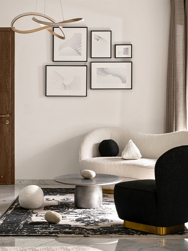 The formal drawing room channels understated glamour in the muted sofa and armchairs that pair immaculately with the Taurus black marble coffee table, crafted in situ. The wall installation adorned with golden touches and furniture embellished with gilded accents enhances the room’s aesthetic.