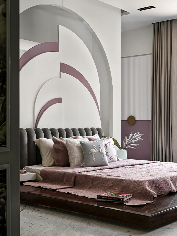 A passageway featuring several art pieces and sculptures leads you to the various personal zones of the first floor, like a master bedroom, and a family lounge area, alongside the two daughters’ bedrooms. The master bedroom notably houses a California king bed and features an arched headboard, evoking a dreamy ambience. Ivory-toned fabric against a wood-covered wall, with subtle brass inlay elements, adds a dash of glamour to the room.