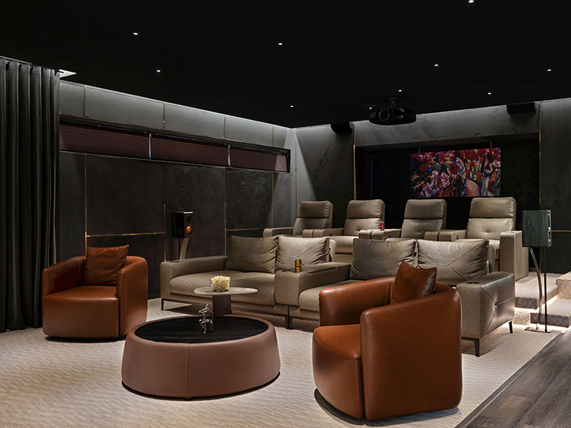 Bringing together this floor’s grand offerings is the home cinema space, boasting ample seating for a sizable audience, a powder room, and a pantry/bar. The soundproofed area, adorned in rich brown, taupe, and black hues, creates a cosy den-like atmosphere. The multipurpose room, enveloped in brick with expansive concrete and a wooden floor, adapts to the family’s changing moods. Equipped with a fitness centre and a music room for their daughters, this versatile space caters to every unique need, solidifying its status as an ideal multigenerational home.