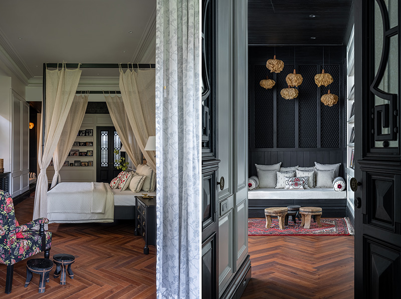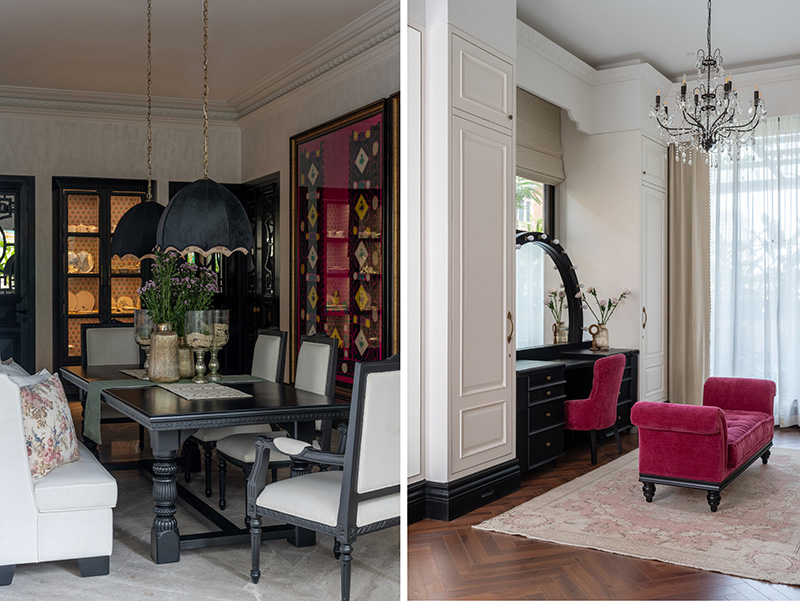 The living room’s dramatic black-and-white palette is elevated by unique artworks and vintage curios that bring life to the space. Here, a 14-foot-high ceiling amplifies the grandeur with a sublimely helical staircase that rises in a crescendo to the upper level, exuding a sense of timeless elegance. Wooden flooring, Neoclassical wainscoting on the walls and magnificently framed scroll paintings intersect together in a tableau that is as eye-catching as it is serene.