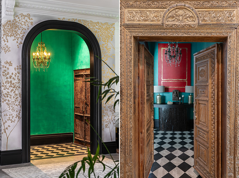 Commissioned by Kanika Dhillon and Himanshu Sharma, both prominent Indian screenwriters and producers, the brief was clear: compose a vibrant space blending deeply rooted tradition with their modern lifestyle. Fittingly titled ‘The Writers’ Retreat’, a mesmerising fable of crystal chandeliers, intricately carved archways and chequered flooring plays out from the entrance itself. This 7,500 sq ft duplex in Four Bungalows, Mumbai is imbued with a hue-heavy, intoxicating vocabulary of maximalism. In light of the homeowners’ esteemed literary acclaim, it felt apropos to embrace an eclectic style, conceiving an idyllic haven for their artistic reflections. The principal designer Shabnam Gupta leaves a distinct mark on every space she designs. Her firm, The Orange Lane, is recognized for drawing inspiration from around the globe while consistently grounding their work in the rich traditions of Indian craftsmanship.